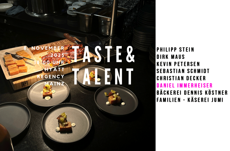 Am 8.November 2025 koche Ich mit vielen tollen Kollegen im Hyatt Regency Mainz. Jeder von uns kocht sein persönliches Lieblingsgericht - authentisch, raffiniert und voller Leidenschaft. Begleitende Weine & Champagner gibt es von Weingütern der Maximen Herkunft Rheinhessen und Champagne Nicolas Feuillatte.